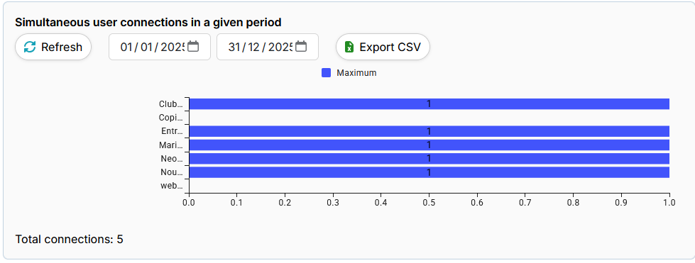 Refresh: Updates the data displayed concerning users' simultaneous connection in real time.