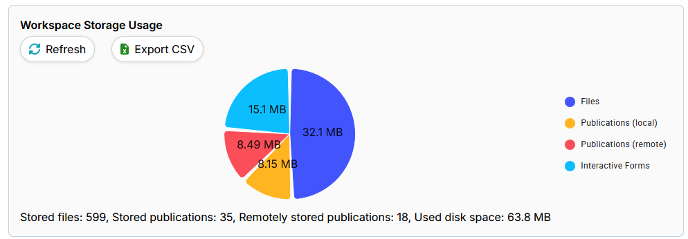 In “Workspace storage usage”, you can see how much disk space is being used, as well as the distribution of storage between files, publications (local and remote) and interactive forms.